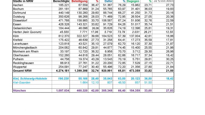 - Das NRW beim Bürgerentscheid mit München gleichgezogen, trifft nicht die Realität. Die Beteiligung liegt in NRW bei 32,74 % in München immerhin bei 42%. In München liegt die Zustimmung aller Wahlberechtigten bei 27,83 % in NRW nur bei 21,5 %.